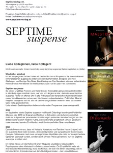 "SEPTIME suspense wurde aus dem Wunsch geboren, neue Wege einzuschlagen. Dabei wollten wir uns allerdings nicht darauf festlegen, dass Spannung lediglich mit dem klassischen Krimi bedient wird, sondern ein breites Spektrum der Abgründe umfasst.